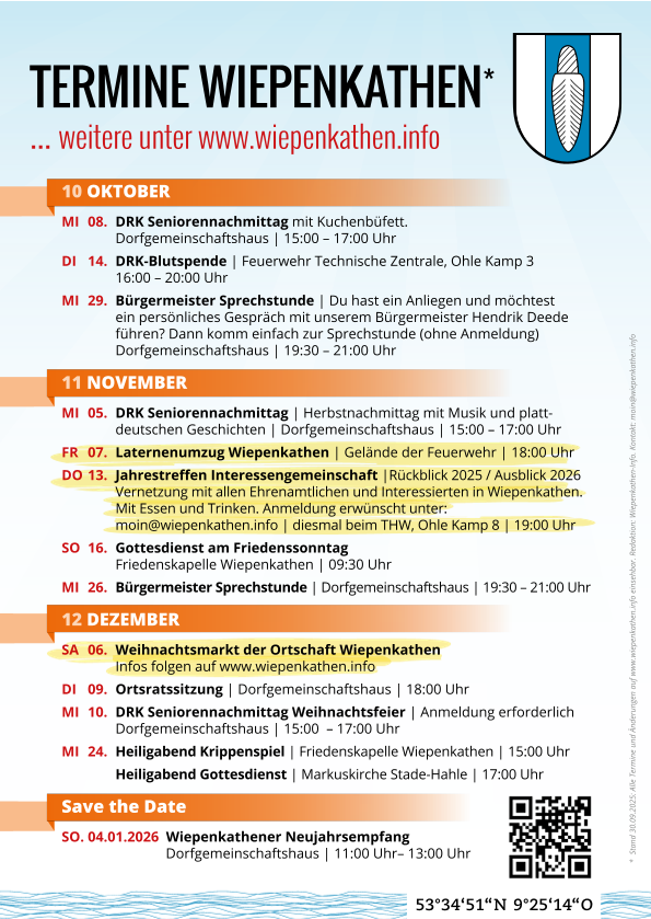 Hier findest Du alle Termine in Wiepenkathen. Diese Seite wurde zuletzt aktualisiert am 10.10.2025
